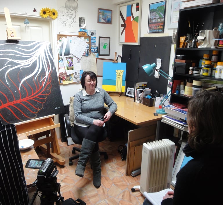 Only when Jo's painting was completed did the three artists come together to see and hear the final results. They met early in the morning at Sinéad's artist studio to interview her, then went to Mathias' recording studio to hear his approaches and interpretations and finally drove to Jo's artist studio to find out more about her unusual gift of hearing colours. Conclusively the three artists talked about the interesting links and themes between their three art pieces.