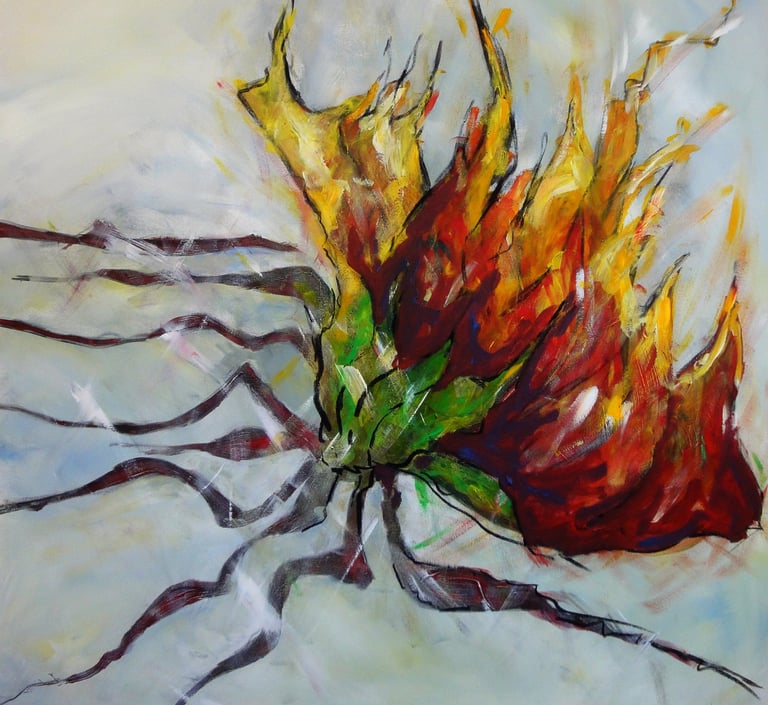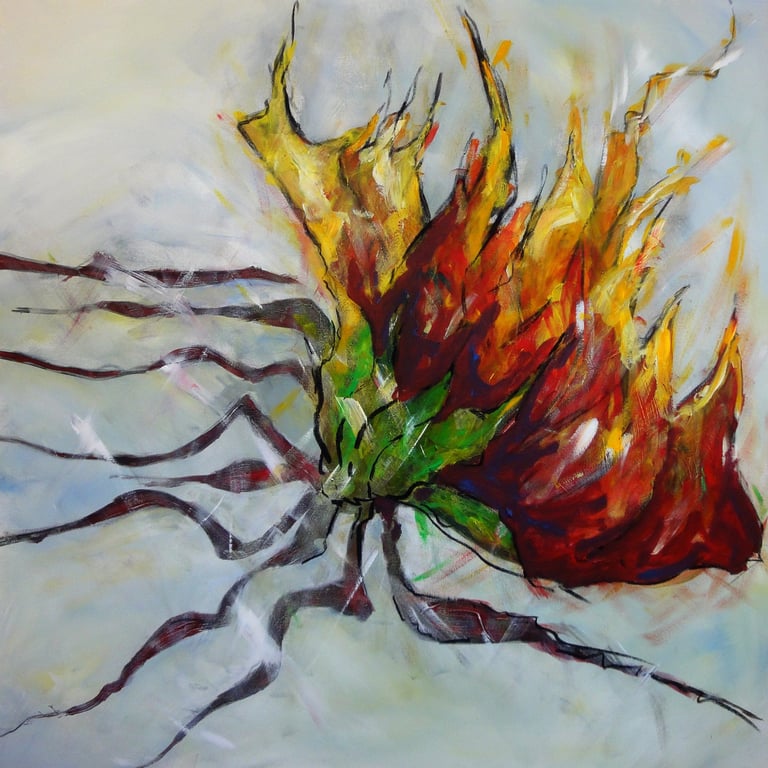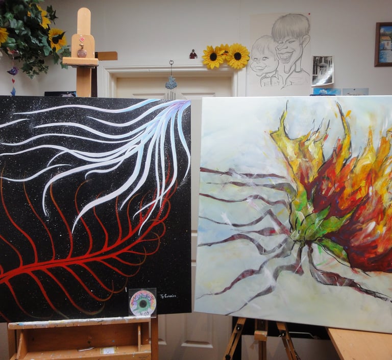 This was my interpretation of Sinead's painting of 'Raíces Del Mundo' when I saw it first. At that time i did not know the title or anything about the painting. So I started to compose my tune 'Nucleus'. The introduction of 'Nucleus represents the middle of the painting (the source-nucleus). The first theme is reflecting the green shapes which develop into purple colours in the interlude. The improvisation focuses on the red and orange parts of the painting. The branches lead to the yellow tops which are connected with eternity. The music reaches theme two. In this eternal background there are other single lines which are also part of creation and together finally meet in the origin of it all. The music seems to start again..."